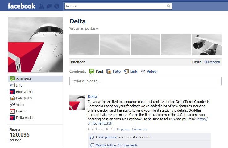 NEWS FACEBOOK VIAGGIA CON DELTA/ ROMA -Da oggi i clienti della Delta Airlines potranno fare il check-in direttamente su Facebook. Il tutto avverrà grazie ad un’applicazione, la ” Delta Ticket Counter”. La Delta aveva avuto già dimestichezza nell’ambito, in quanto aveva creato un precedente per quanto riguarda le applicazioni per dispositivi mobili come IPhone e BlackBerry, obiettivo facilitare la vita ai propri clienti. Da oggi tutto diventa ancora più semplice, rispetto a prima c’è una novità, il social network permetterà anche la stampa della carta di imbarco senza che sia necessario andare sul sito della Delta. Solitamente è Facebook che una ne pensa e mille ne fa, in questo caso la Delta non è stata da meno, certo è che prima di condividere sul social network più famoso del mondo i dettagli del proprio volo bisognerà pensarci un po’ su.