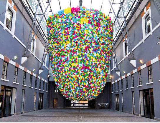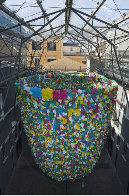 La particolarità di tale opera non è solo nelle sue dimensioni o nella scelta del soggetto quanto piuttosto nel particolare materiale con cui è stata realizzata: i folgoranti colori dell’istallazione sono infatti dovute ad un numero esagerato di bustine di plastica, assemblate una accanto all’altra per comporre il gigante cono.