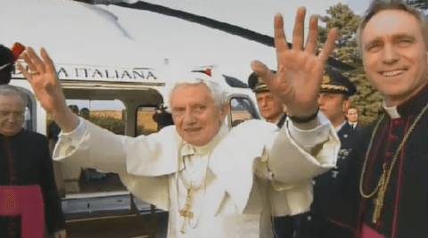 Le immagini del Papa che lascia San Pietro \ Roma – E’ iniziato il viaggio di Benedetto XVI verso le sue ultime ore come Sommo Pontefice della Chiesa. Il Papa ha infatti abbandonato San Pietro alla volta di Castel Gandolfo: in molti si sono fermati a vedere l’elicottero che portava il Papa lontano da quella che negli ultimi anni è stata la sua dimora: ora il Pontefice è arrivato a Castel Gandolfo e ha rivolto un veloce saluto ai fedeli che lo attendevano sotto il piccolo balcone.