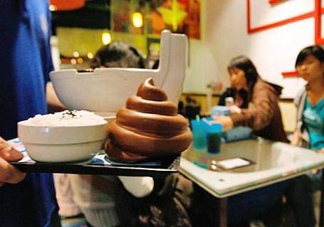 Al Modern Toilet Restaurant (catena di ristoranti giapponesi) tutti i cibi vengono serviti in piatti a forma di wc. Se per dessert scegliete il gelato al cioccolato è facile immaginare che forma abbia.