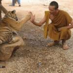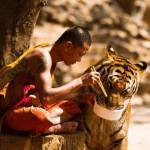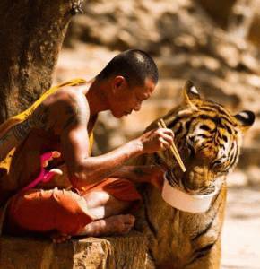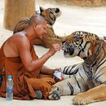 Il tempio buddista dove vivono le tigri \Roma – Far mangiare con il biberon una tigre o coccolarla come fosse un docile micione domestico: non sono di certo immagini che si vedono tutti i giorni. Questo però accade quotidianamente in Thailandia e più precisamente nel tempio buddista di Kanchanaburi conosciuto anche con il nome di Tiger Temple. Da decenni in questo magico luogo i monaci buddisti che vi vivono si prendono cura delle tigri indocinesi che giungono al tempio da cucciole o sono rimaste orfane. Queste immagini, in cui si vede un docile monaco buddista, con la sua tunica arancione, dare da mangiare con le mani al felino più forte presente in natura, hanno fatto il giro del mondo, facendo diventare il Tiger Temple ( situato a 100 km circa da Bangkok) ancora più famoso. Anche i turisti possono entrare nel tempio e lasciarsi sopraffare dall’incredibile atmosfera religiosa e non che vi si respira. Non solo si possono osservare i monaci che accudiscono enormi tigri ma, con molta delicatezza e tatto, questi formidabili animali possono essere accarezzati e coccolati proprio come fossero dei gatti.