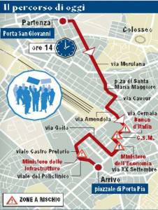 Il corteo sfilerà dalle 14 alle 20: la partenza è prevista da piazza di Porta San Giovanni; i manifestanti si dirigeranno poi verso via Merulana, piazza di Santa Maria Maggiore, via Liberiana, via Cavour, via Giovanni Amendola, viale delle Terme di Diocleziano, piazza della Repubblica, via Cernaia, via XX Settembre, via Goito, piazza dell’Indipendenza, via San Martino della Battaglia, viale Castro Pretorio, piazza della Croce Rossa, viale del Policlinico, per fermarsi a Porta Pia.