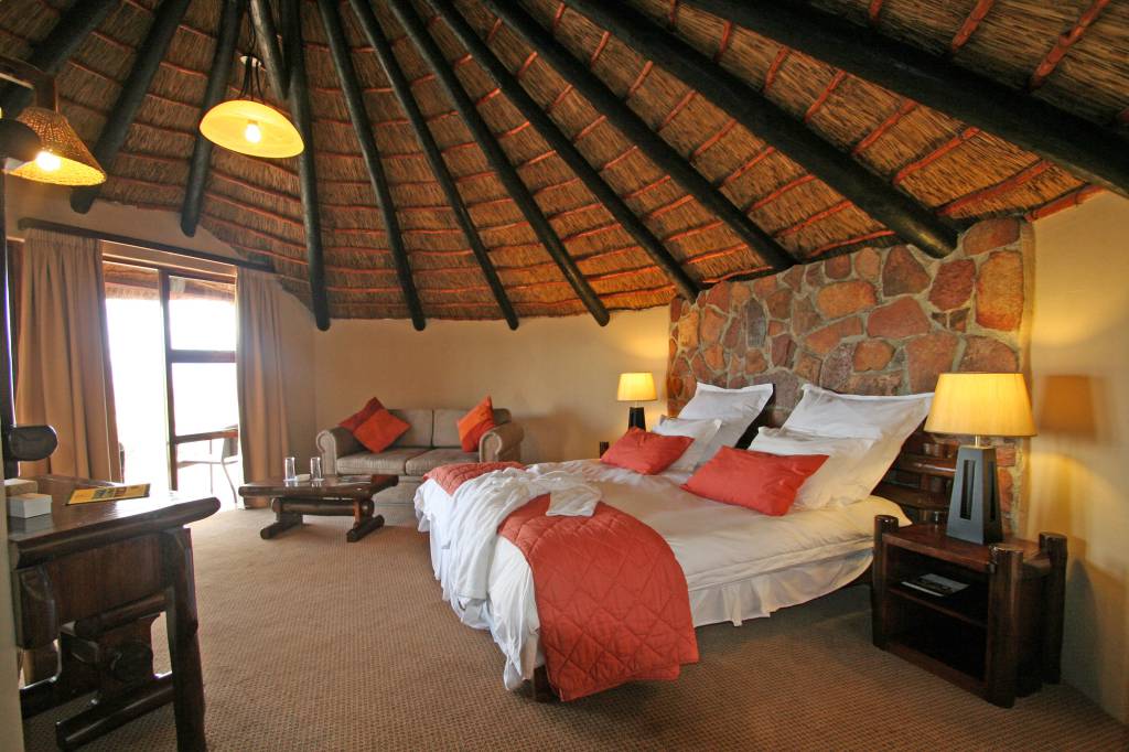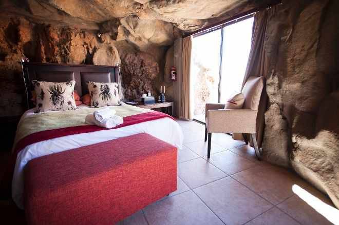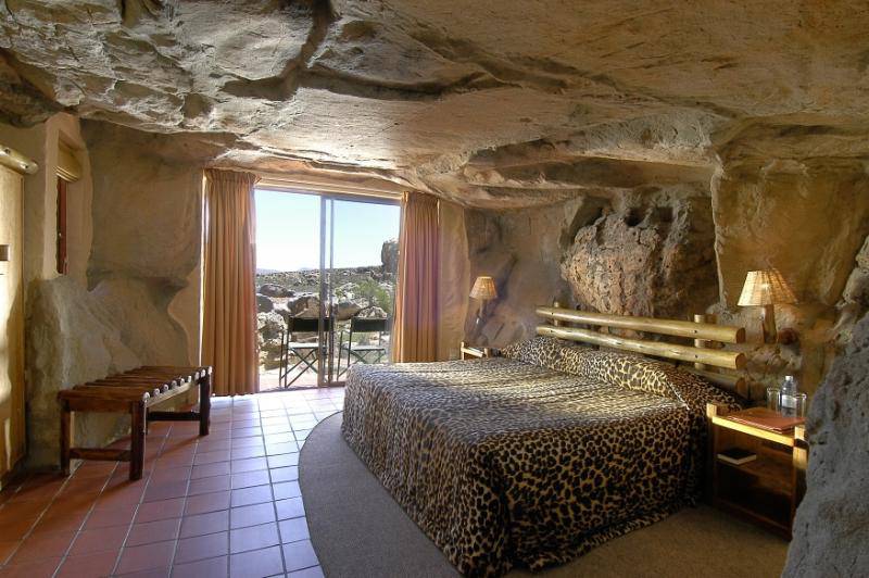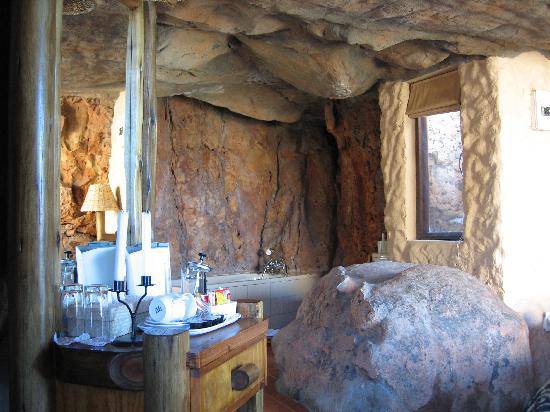 L’albergo è stato ricavato da una casa Boscimane (popolazione che abita il deserto del Kalahari e caccia con frecce avvelenate, ragion per cui i boscimani sono chiamati uomini scorpione), all’interno di antiche rocce nelle quali è possibile ancora oggi ammirare delle pitture rupestri risalenti a circa 6000 anni fa.