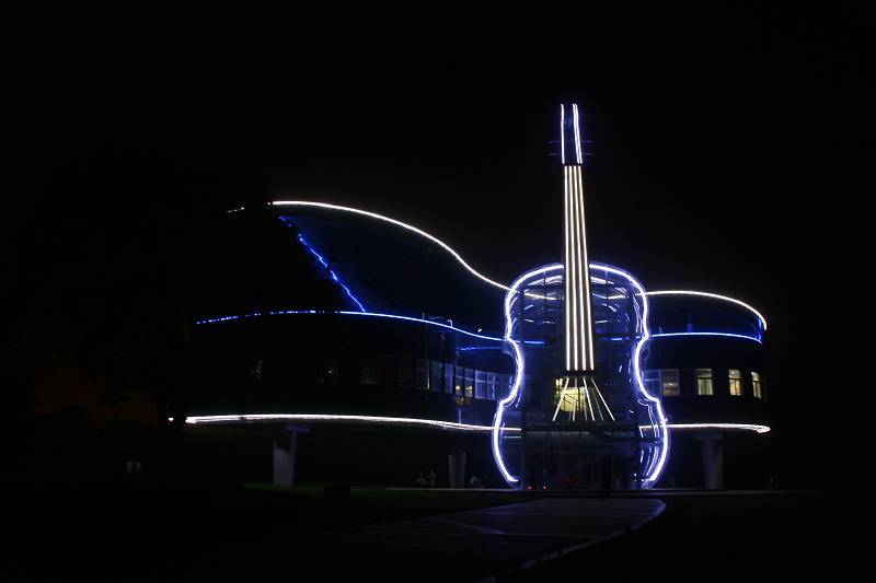 Durante la notte la Piano House diventa ancora più suggestiva per l’illuminazione fluorescente che delinea i due strumenti. Un’architettura davvero particolare che avvicina al mondo della musica tutti, dai più piccoli ai più grandi amanti o meno del genere.