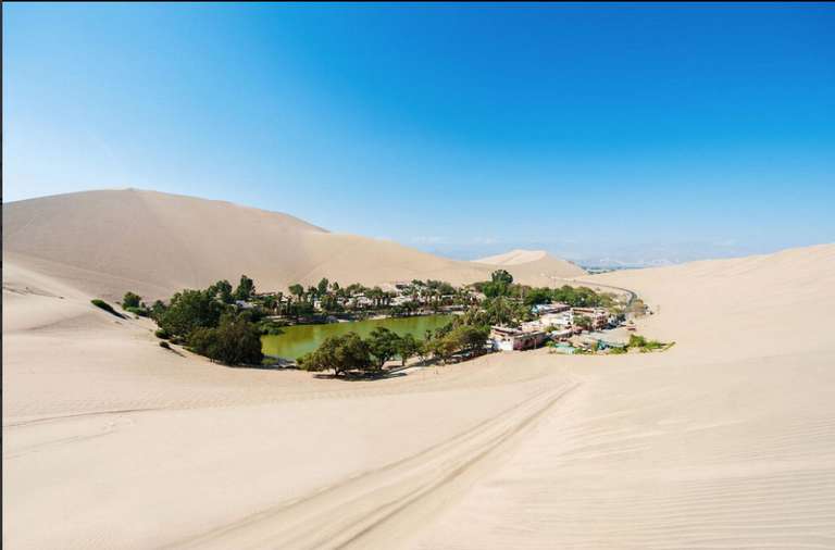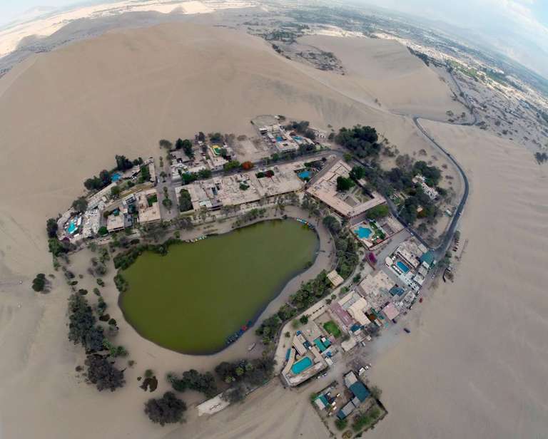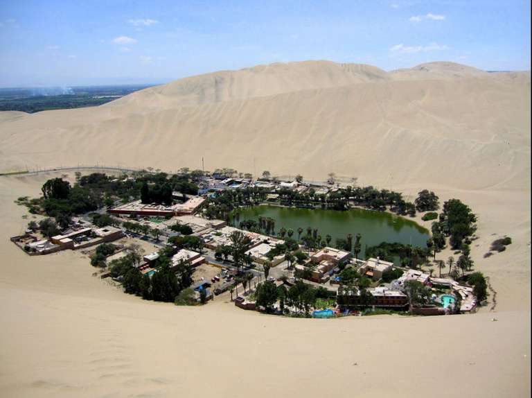 Nascosta tra le alte dune di sabbia nel deserto del Perù, a pochi chilometri dalla costa atlantica, si trova la piccola oasi di Huacachina, meta ambita per le vacanze dagli abitanti di Ica e del Perù in genere. Diversi gli alberghi nati qui per accogliere i tanti ospiti che ivi si recano per praticare il sandboarding, una sorta di snowboarding sulla sabbia.