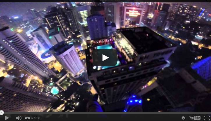 Si chiama base jumping ed è uno tra i tanti sport estremi che vede delle persone lanciarsi nel vuoto provvisti di paracadute partendo da una superficie di appoggio. Adrenalina a fiumi per questi tre ragazzi che si sono trovati nella capitale malese per il grande evento di base jumping, il Kuala Lampur Tower Base Jump, e che hanno deciso, a fine manifestazione, di tuffarsi uno ad uno nel palazzo di fronte a loro dove stavano festeggiando la giornata appena trascorsa. È stata una vera e propria sorpresa che, per alcuni istanti, ha anche fatto temere il peggio ai presenti che avevano paura si schiantassero contro i vetri del palazzo di fronte. Uno dei giovani “saltatori” aveva indosso una videocamera e ha ripreso tutto!