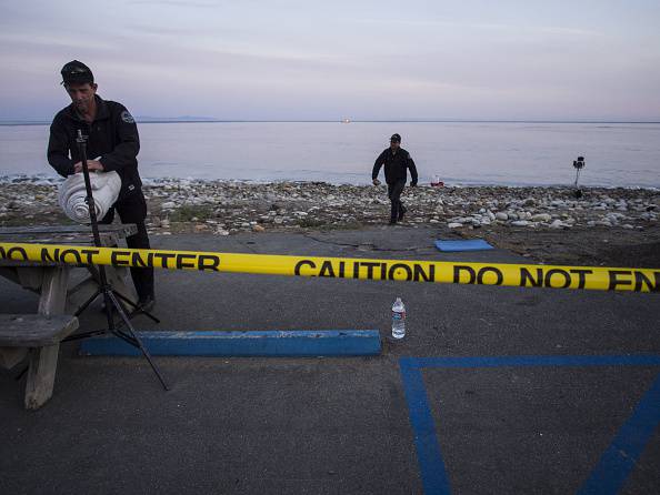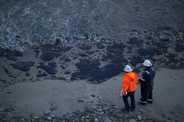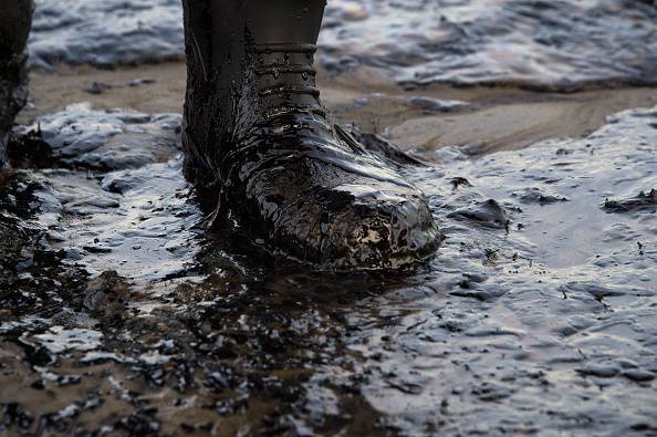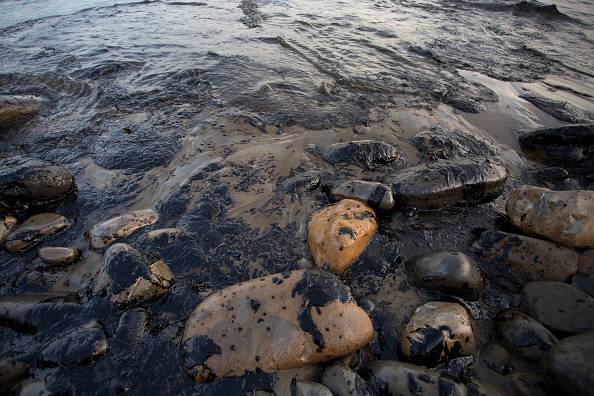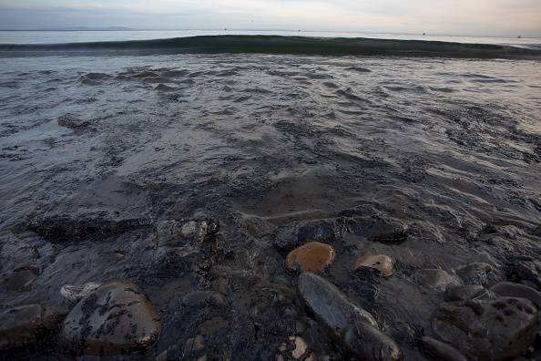 GOLETA, CALIFORNIA - MAY 19:  Spilled oil covers the beach at Refugio State Beach as the Channel Islands are seen in the distance on May 19, 2015 north of Goleta, California. About 21,000 gallons spilled from an abandoned pipeline on the land near Refugio State Beach, spreading over about four miles of beach within hours. The largest oil spill ever in U.S. waters at the time occurred in the same section of the coast where numerous offshore oil platforms can be seen, giving birth to the modern American environmental movement.  (Photo by David McNew/Getty Images)