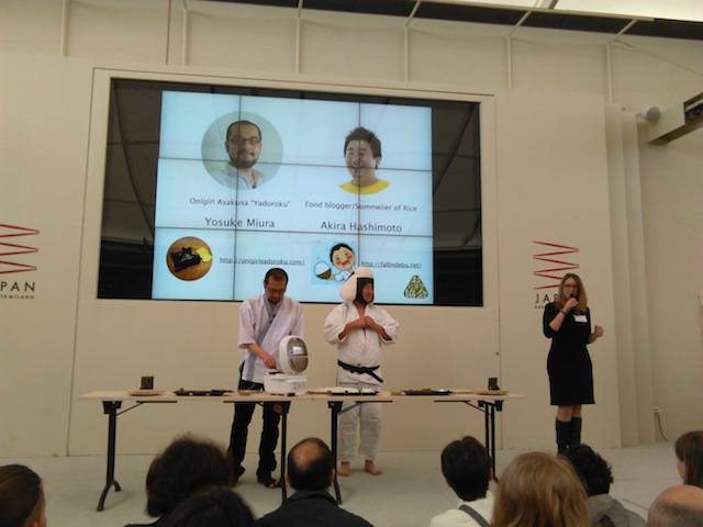 Expo 2015: al padiglione del Giappone c’è stata la presentazione, la preparazione e soprattutto la degustazione degli Onigiri. Che cosa sono? Molti in realtà li conoscono grazie ai cartoni animati: semplificando molto gli Onigiri sono delle polpette a forma triangolare fatte con il riso e con altri ingredienti come la carne o le verdure. Si mangiano avvolgendoli nell’alga nori per evitare che il riso si appiccichi alle dita. Ma cosa c’è oltre a questo? Ce lo hanno spiegato Yosuke Miura, maestro nell’arte della preparazione degli Onigiri, nonché proprietario a Tokyo del più antico ristorante in cui questo cibo giapponese viene preparato, e Akira Hashimoto, food blogger e “sommelier del riso”.