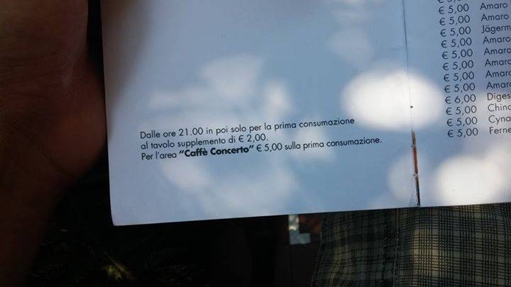 Viagginews.com prima di lanciare accuse ha voluto infatti vederci chiaro su questa vicenda ed ha contattato il bar incriminato, il Calise Bar, un bar, ristorante-pizzeria, una vera istituzione dell’Isola, dotato di un rigoglioso giardino dove poter gustare specialità ischitane o anche semplicemente un caffè – a detta di molti uno dei migliori dell’isola – a due passi dal celebre Castello Aragonese. I prezzi sono tutti riportati sul menù: il caffè al tavolo costa 2 euro, al banco 1 euro. E quindi cosa sono quei 5 euro di servizio? “La sera dalle 21 fino alle 2 di notte c’è un pianista che suona – ci spiega dal Bar Calise uno dei cassieri – sono serate particolari per cui si paga un extra”. Un extra indicato sia sui menù sia sui cartelli all’ingresso del giardino :”Ovunque c’è scritto che la sera quando c’è musica dal vivo la prima consumazione ha un costo extra di 5 euro”. Quindi al di fuori di queste serate un caffè al tavolo costa 2 euro: “Assolutamente sì – ci ribadiscono dal Calise – Se lei viene il pomeriggio e si accomoda in giardino, per un caffè paga 2 euro e nulla più. La sera c’è il supplemento di 2 euro, nelle serate concerto di 5. E’ tutto scritto”. Ma intanto il vortice di polemiche al grido ‘vergogna’ impazza sul web: “Dispiace ovviamente, ma sappiamo che è una bolla di sapone, siamo tranquilli della nostra onestà e del nostro valore”.