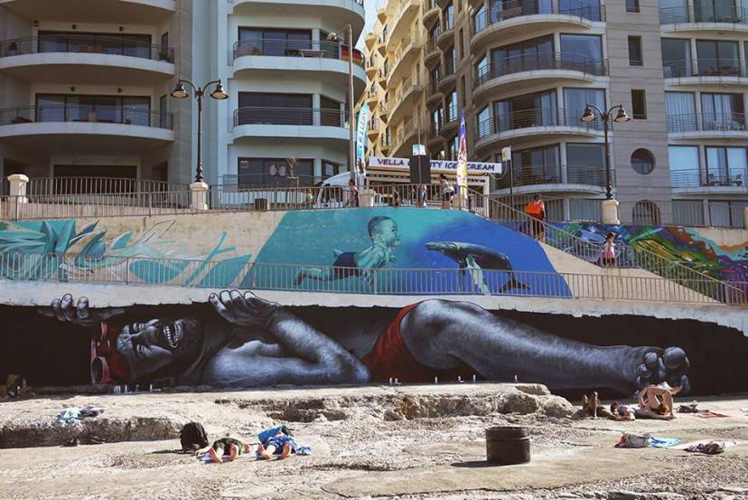 La storia del migrante disperato nell’attraversamento del tunnel del Mediterraneo è completata da un altro murale, quello dello stesso migrante disteso e schiacciato dal medesimo tunnel. Quest’opera si trova sempre a Sliema, a Malta, proprio davanti al mare, ed è stata completata nel 2014 in occasione dello street art festival della città. Un monito su una tragedia che sembra non avere fine.