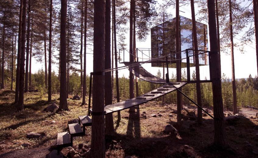 Tree Hotel, Lapponia Svedese: situato sugli alberi, esattamente come i nidi degli uccelli, vanta camere uniche con l’immancabile sauna a 6 metri d’altezza. Come fare per raggiungere la propria stanza? Attraverso un sistema di ponti e scale degni di un parco avventura.