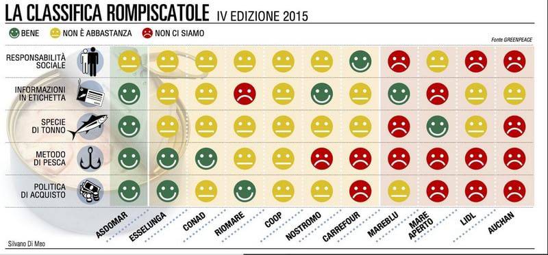 Ecco quindi il ‘Rompiscatole’, due anni dopo l’ultima edizione che prende in esame undici marchi, valutati in base a politiche di acquisto, trasparenza e adozione di precisi criteri di sostenibilità ambientale e sociale. A trionfare è il tonno tutto italiano Asdomar, che grazie alle azioni intraprese per mettere nelle sue scatolette tonno pescato con tecniche sostenibili, come la pesca a canna, sale al primo posto in classifica. Seguono Esselunga e Conad per via delle loro politiche d’acquisto che evitano tecniche di pesca distruttive. Al quarto posto Rio Mare, il più venduto in Italia, che invece purtroppo solo una parte della sua produzione è affidata a metodi sostenibili. Bocciato il celebre Mareblu, in questo caso nonostante le promesse il suo pescato è fatto quasi interamente con metodi di pesca nocivi per l’ambiente.