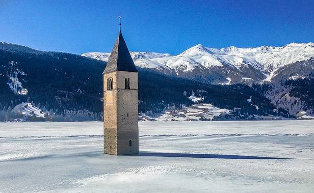Dal web Andare al Lago di Resia, a Curon Venosta, Alto Adige: qui c’ una chiesa del 14esimo secolo sommersa, ma quando il lago ghiaccia si può raggiungere.