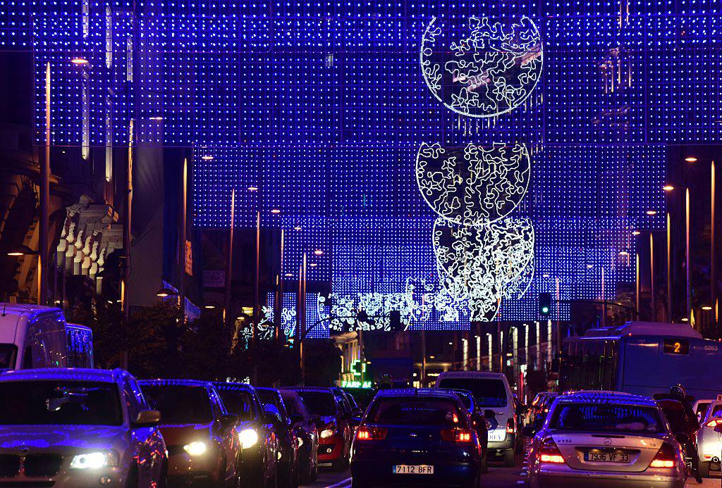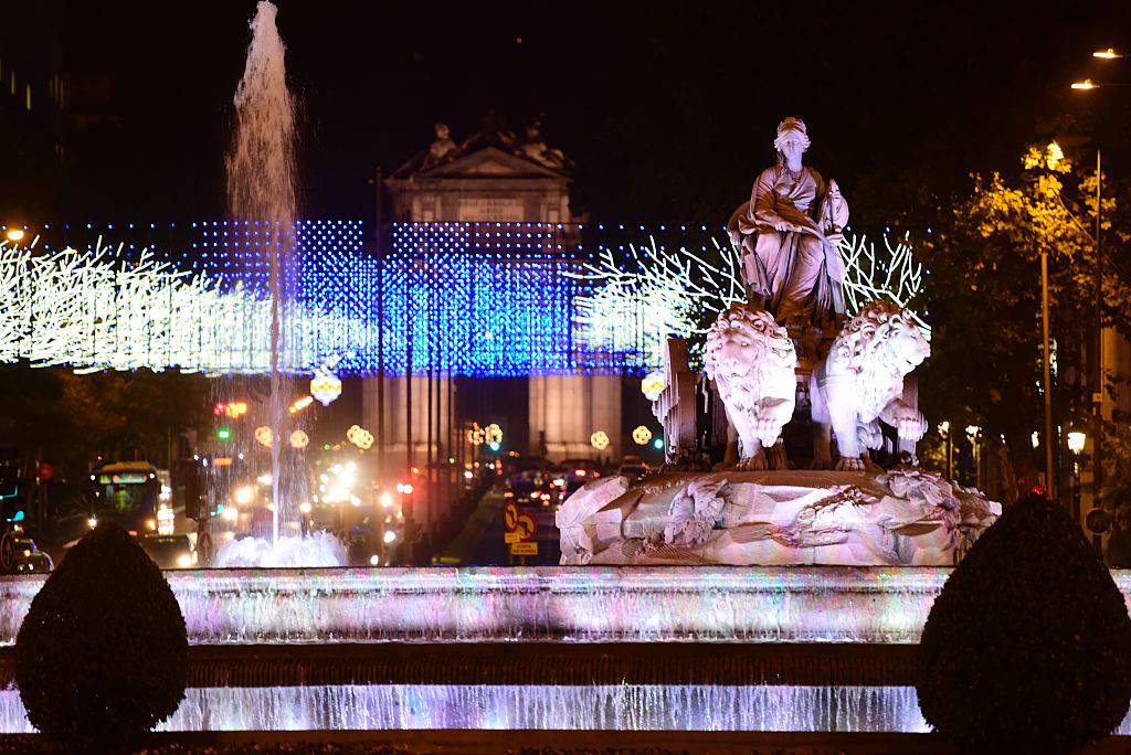 Luminarie natalizie tra Puerta de Alcala e la fontana di piazza Cibeles, centro di Madrid.
