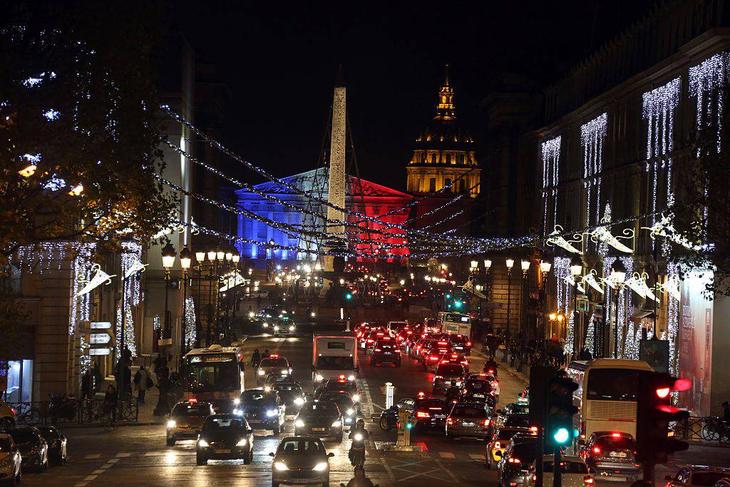 Dopo i tragici attentati del 13 novembre, Parigi cerca di tornare alla normalità, anche con le luci di Natale. Nella foto Rue Royale, con l’Assemblea Nazionale in fondo illuminata con il tricolore.