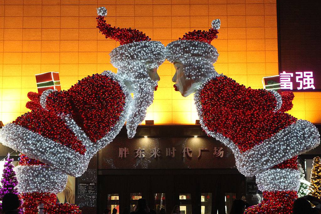 Babbi Natali giganteschi illuminati da migliaia di luci, per la verità un Babbo e una Mamma Natale che stanno per baciarsi prima dello scambio dei doni. Sembra più un’immagine da San Valentino e forse si è voluto un po’ mescolare le due feste che non sono proprio originarie di queste parti. Siamo in Cina a Xuchang, nella provincia di Henan.
