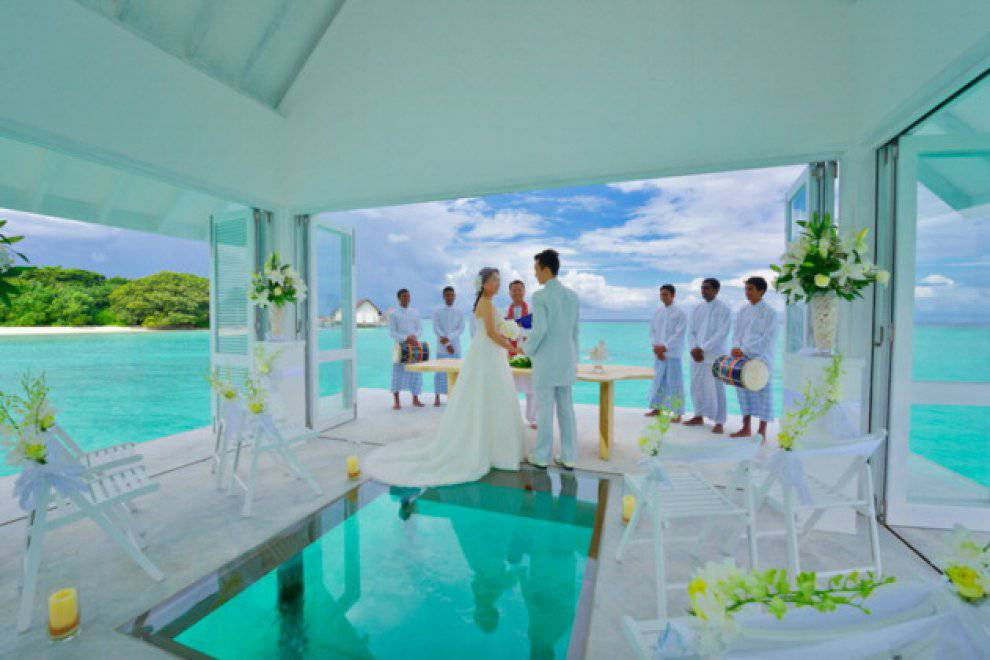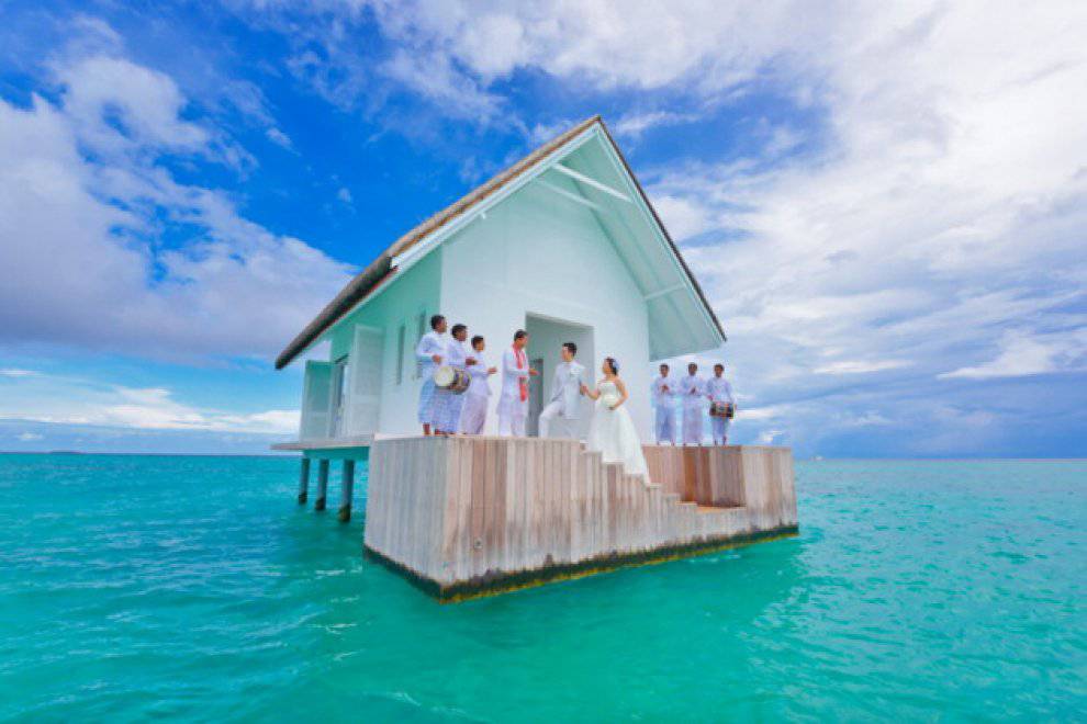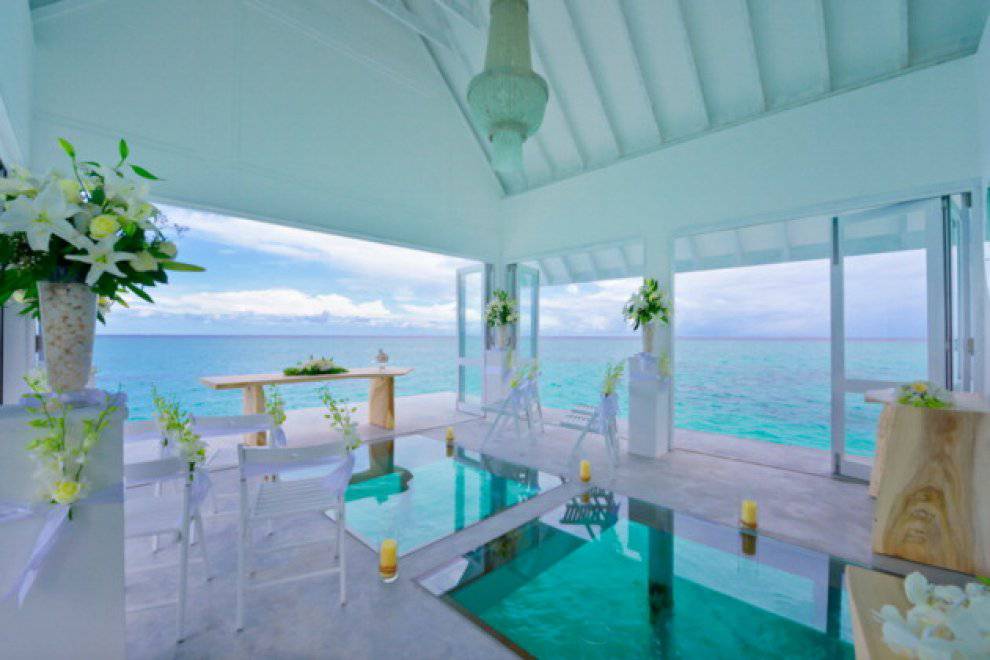 Già di per sé un atollo in mezzo all’Oceano Indiano è un posto meraviglioso ed una location fantastica per rilassarsi, divertirsi o celebrare quello che volete. Ecco, a questo luogo strepitoso aggiungete una palafitta in mezzo al mare con il pavimento in vetro per ammirare i pesci ed avrete il posto più bello al mondo dove sposarsi.