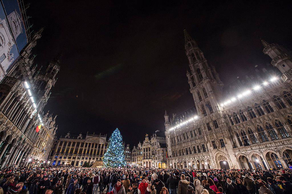 La folla sulla Grand Place di Bruxelles per celebrare comunque il 2016, nonostante la cancellazione della festa ufficiale e dei fuochi di artificio.
