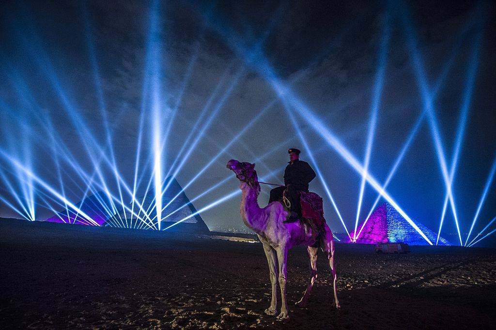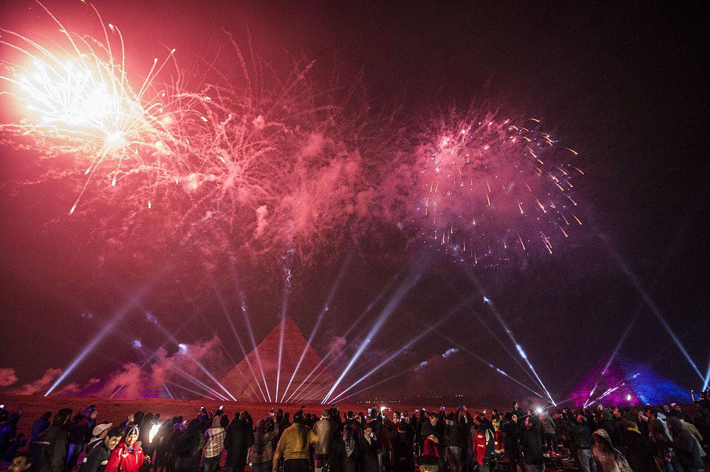 Le celebrazioni per il nuovo anno davanti alle Piramidi egiziane, Il Cairo.