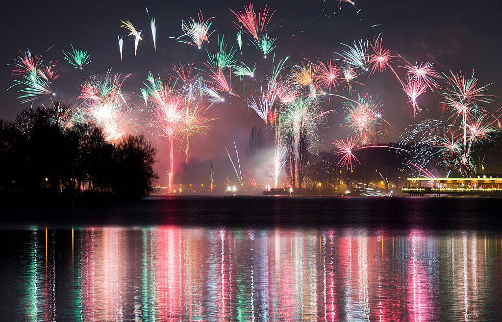 Fuochi di artificio sul lago Maschsee ad Hannover, Germania.