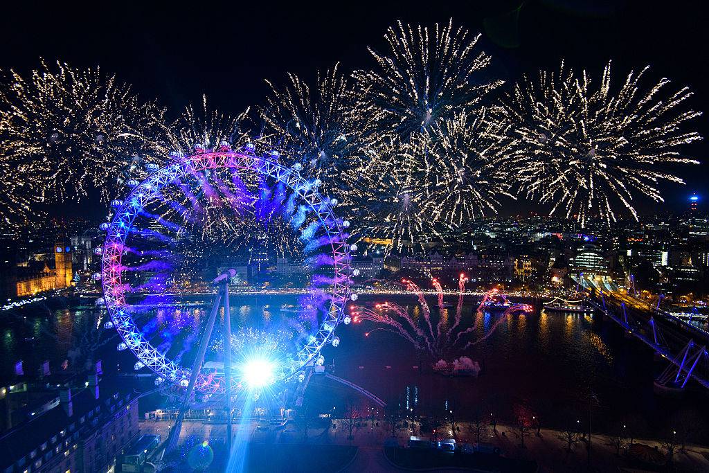Ancora fuochi di artificio a Londra, la ruota panoramica London Eye e il fiume Tamigi.