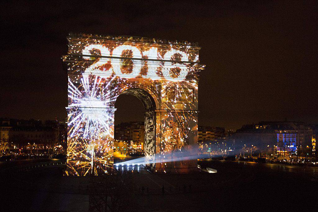 Anche Parigi festeggia l’arrivo del 2016 con moltissima gente per le strade. Niente fuochi di artificio, ma giochi di luce sull’Arco di Trionfo.