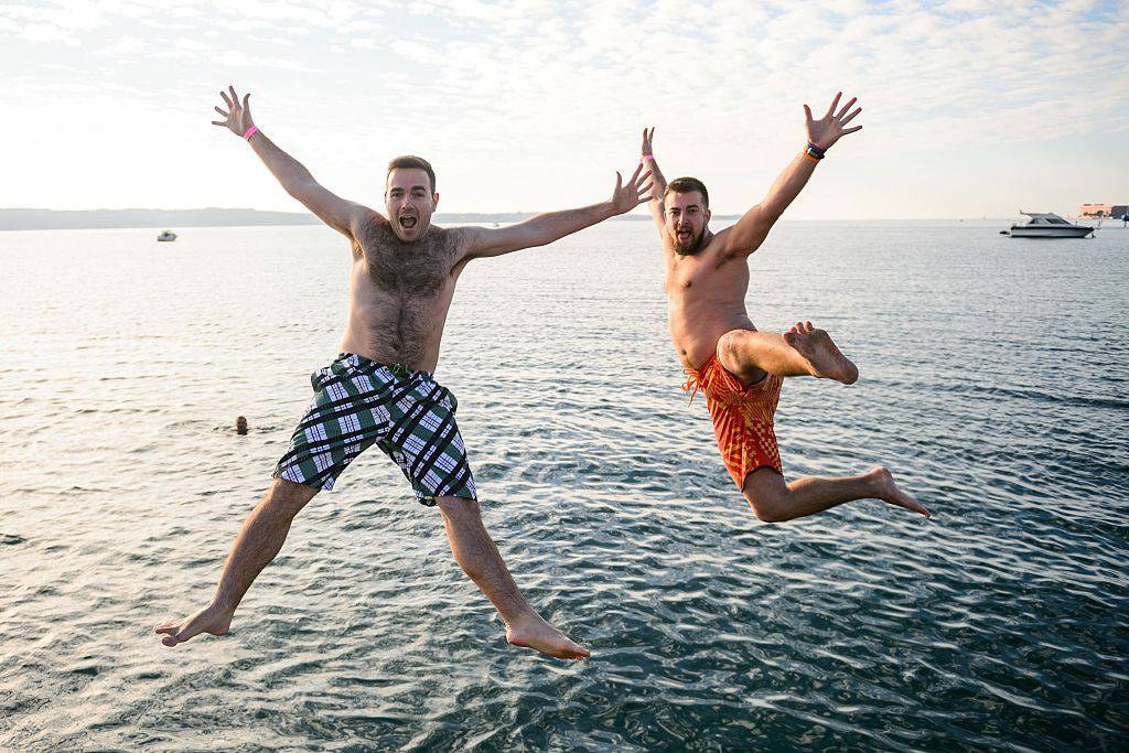 Bagno di Capodanno a Portoroz (Portorose), in Slovenia. La tradizione del bagno in mare il giorno di Capodanno è diffusa in molte parti del mondo. La città balneare slovena si affaccia sulla parte sud del Golfo di Trieste.