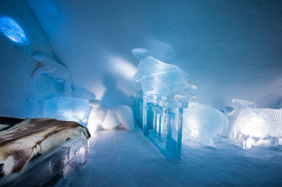 All’Ice Hotel di Jukkasjärvi ogni singolo pezzo di ghiaccio, dai muri ai pavimenti ai soffitti sono tele per i disegni dei creativi che ogni anno rendono la loro personale interpretazione.