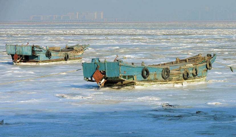 Barche da pesca intrappolate nel mare ghiacciato nella baia di Jiaozhou, a Qingdao, nella provincia orientale dello Shandong.
