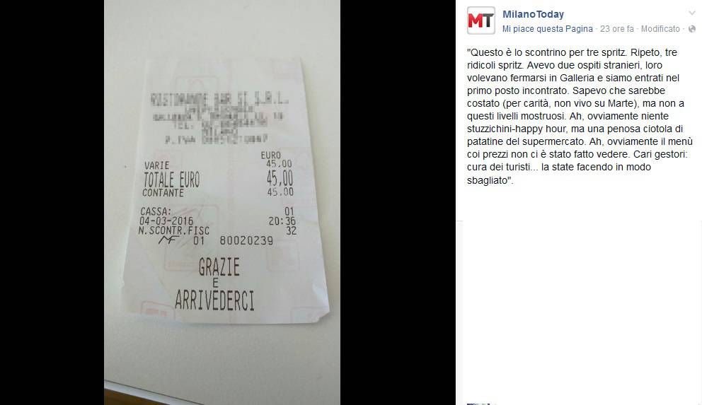 “Questo è lo scontrino per tre spritz. Ripeto, tre ridicoli spritz. Avevo due ospiti stranieri, loro volevano fermarsi in Galleria e siamo entrati nel primo posto incontrato. Sapevo che sarebbe costato (per carità, non vivo su Marte), ma non a questi livelli mostruosi. Ah, ovviamente niente stuzzichini-happy hour, ma una penosa ciotola di patatine del supermercato. Ah, ovviamente il menù coi prezzi non ci è stato fatto vedere. Cari gestori: cura dei turisti… la state facendo in modo sbagliato“