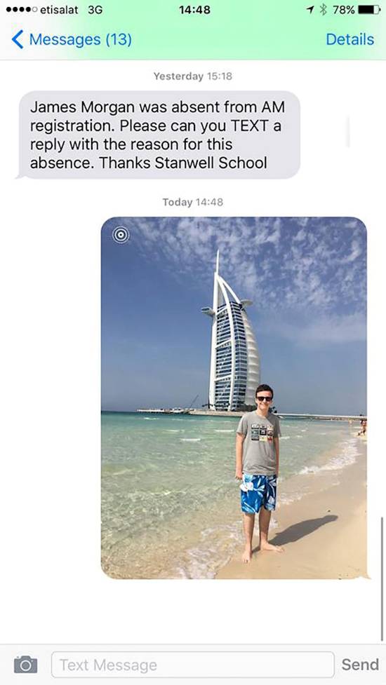 Mentre erano in vacanza a Dubai la scuola di suo figlio, la Stanwell School, gli manda un sms: “James Morgan era assente oggi all’appello. Si prega di inviarci un sms di risposta con la motivazione dell’assenza. Grazie Stanwell School’.