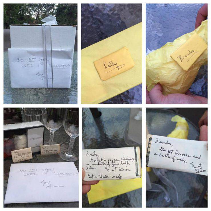 La prozia suggeriva con due biglietti quello che secondo lei è il segreto di una coppia felice: a Kathy diceva di comprare una pizza e a preparare un bagno, mentre a Brandon si suggeriva di comprare dei fiori e del vino. Oltre a questo il regalo conteneva dei soldi, due bicchieri di vino, un vaso e dei sali da bagno. La cara zia Alison la sa lunga, insomma.