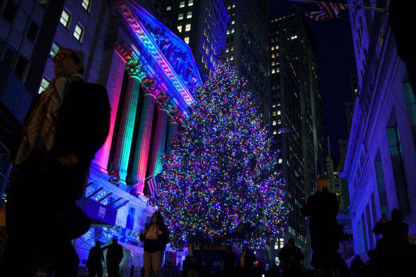 Il grande albero di Natale davanti alla Borsa di New York, a Wall Street.