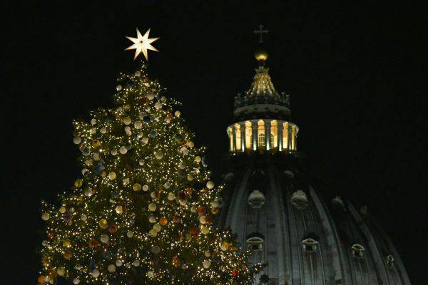 L’albero di Natale in Piazza San Pietro, sullo sfondo la cupola della Basilica. Roma, Città del Vaticano.