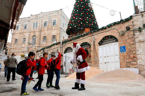 Albero di Natale, Babbo Natale e alcuni bambini nel quartiere cristiano di Gerusalemme Vecchia.