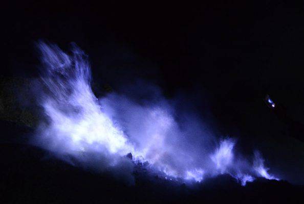 Il colore blu luminescente è visibile solo di notte ed è causato dall’incendiarsi dello zolfo quando entra in contatto con l’aria.