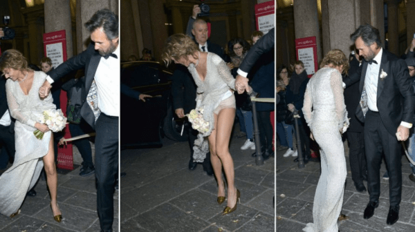 Lui elegantissimo in abito scuro e papillon e lei bellissima con un abito bianco lungo e e meno sobrio: spacco profondo, pailettes ovunque, trasparenze, scarpe dorate e tacchi alti. Ed è proprio la sposa che é stata vittima e protagonista di un piccolo incidente di percorso: non appena erano scesi dalla macchina, un agente della sicurezza privata, involontariamente ha calpestato lo strascico della sposa strappandole il vestito.