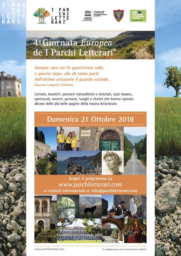 Domenica 21 ottobre 2018 e la IV Giornata Europea dei Parchi Letterari, promossa da Paesaggio Culturale Italiano. L’iniziativa propone letture, incontri nei parchi più belli d’Italia, e non solo, con percorsi naturalistici e letterari, mostre, case museo, luoghi e ricette dei luoghi di ispirazione letteraria. Una iniziativa che parte dalla Sicilia e arriva fino al Circolo Polare Artico.