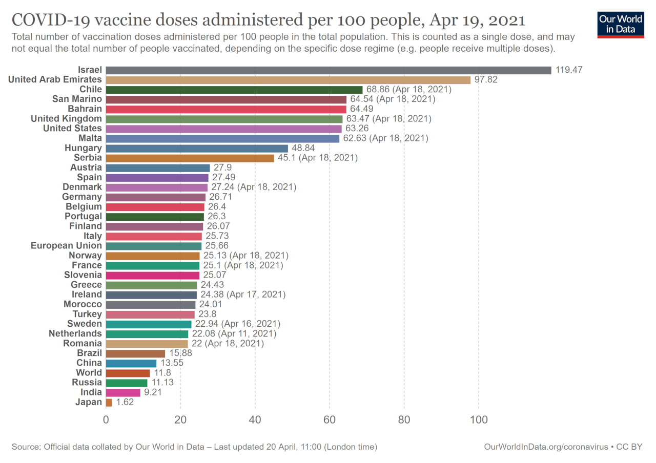 Quindi segue il Regno Unito che, con oltre 43 milioni di dosi complessive somministrate e oltre 10 milioni di persone completamente vaccinate, ha somministrato 63,47 dosi ogni 100 abitanti (dati al 18 aprile).