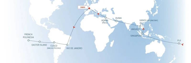 Per chi può permettersela è sicuramente l’esperienza di viaggio della vita. Un vero e proprio giro intorno al mondo, della durata di 22 giorni, con partenza da Parigi, toccando alcune delle mete di viaggio più belle e spettacolari del nostro pianeta. Paesaggi esotici, isole tropicali, deserti, alcune grandi città ma non troppe. Mete di viaggio tradizionali e nuove, per vivere emozioni indimenticabili.