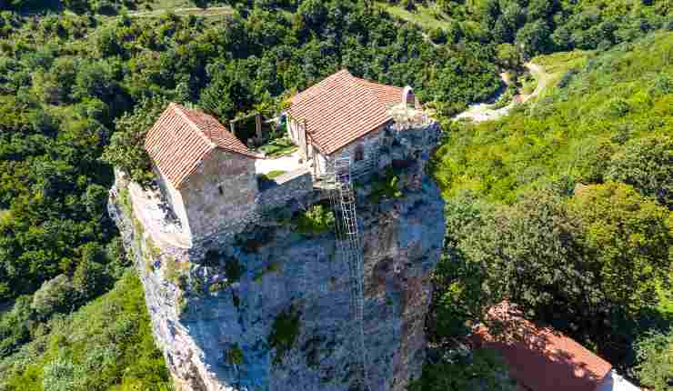 Per arrivare a questa chiesa occorre fare un pellegrinaggio mistico molto intenso e provante, anche a livello fisico. Si tratta di 131 scalini attaccati alla parete in ferro praticamente a strapiombo nel vuoto. Chi li fa? Sicuramente il sacerdote ortodosso Maxime Qavtaradze che, dal 1995, vive qui in solitudine e scendendo in paese solo 1 volta alla settimana.