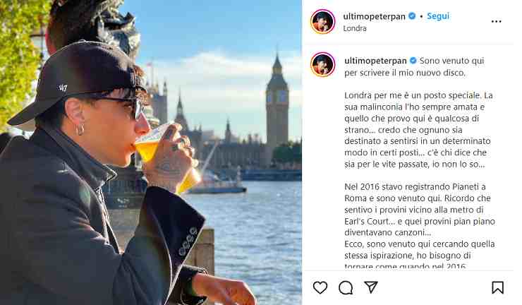 Ma il suo legame con Londra risale a tanto tempo fa. Nel 2016, mentre stava registrando Pianeti, è venuto qui e ha trovato il giusto spirito per ultimare il disco. “Ecco, sono venuto qui cercando quella stessa ispirazione – continua ancora Ultimo parlando ai suoi fan tramite i social – Ho bisogno di tornare come quando nel 2016 camminavo qui e mi chiedevo “chissà dove arriverò con questa musica”. Ho bisogno di ritrovare quel bellissimo senso di smarrimento che ogni ragazzo prova mentre insegue un sogno molto più grande di lui”.
